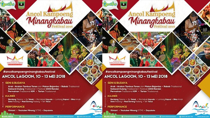 Ancol Kampoeng Minangkabau Festival 2018 akan diselenggarakan selama empat hari mulai tanggal 10 – 13 Mei 2018 di Pantai Lagoon Ancol, Jakarta Utara.