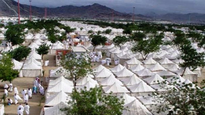 Pohon setinggi kurang lebih tiga meter hingga empat meter menjadi tempat berlindung para jemaah haji yang menjalankan wukuf.