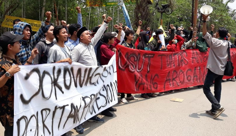 TRIBUNJAKARTA.COM, CISAUK - Puluhan masyarakat Setu, Tangerang Selatan (Tangsel) dan gabungan mahasiswa dari berbagai organisasi, berunjuk rasa di depan Mapolsek Cisauk, Jalan Raya Cisauk, Cisauk, Kabupaten Tangerang, Kamis (18/10/2018).