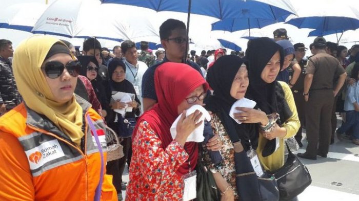 Selepas menabur bunga dari bagian belakang KRI Banjarmasin yang membawa keluarga korban, wanita itu tampak menangis tersedu-sedu sambil bertumpu pada pagar buritan kapal tersebut.