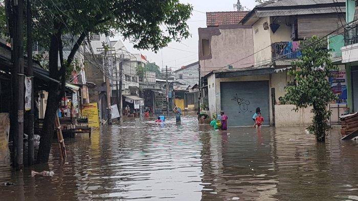 Pantauan TribunJakarta.com, saat ini warga tetap melaksanakan aktivitasnya seperti membeli gas dan air galon, sambil menerobos banjir tersebut.