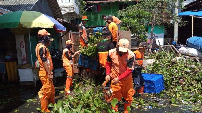 PPSU dan UPK Badan Air Jakarta Utara membersihkan tanaman liar eceng gondok, di lapangan Kobra, Kelurahan Rawa Badak Selatan, Koja, Jakarta Utara.