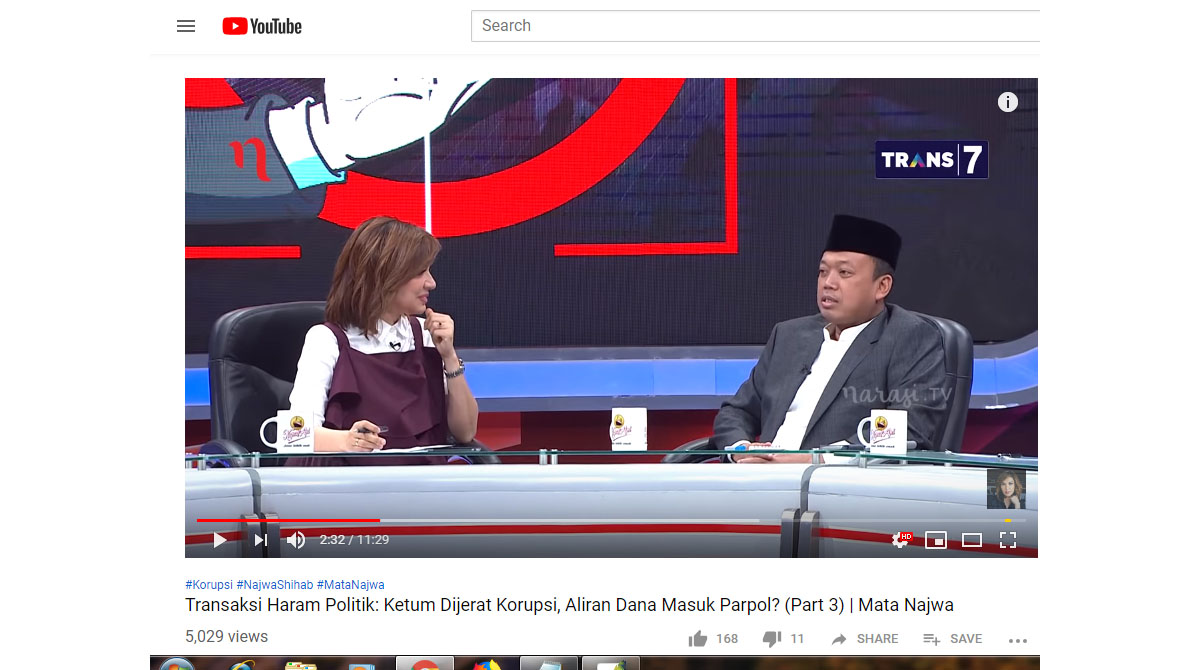 Hal itu terjadi saat Ketua DPP Partai Golkar Nusron Wahid menjadi narasumber di acara Mata Najwa Trans 7 yang diunggah kanal YouTube Najwa Shihab pada Kamis (21/3/2019).