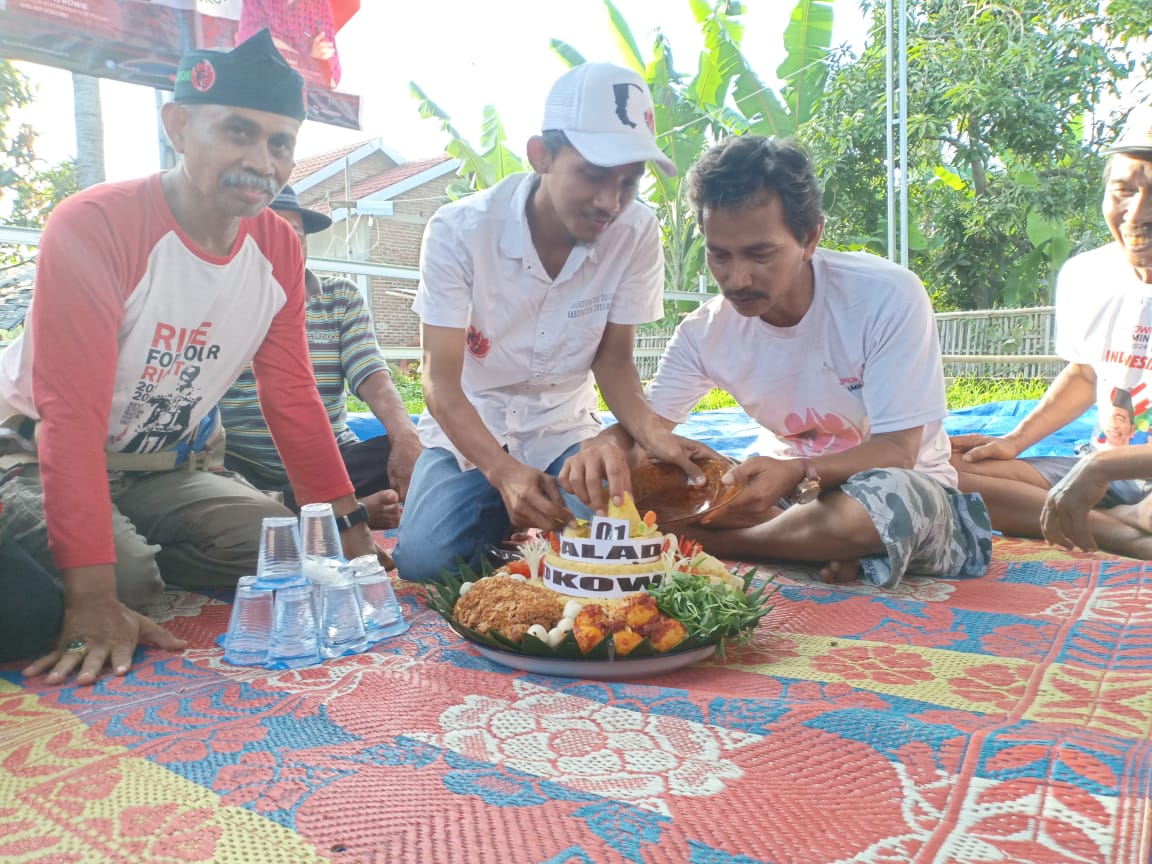 Acara syukuran diisi dengan pemotongan tumpeng, dan menggunduli rambut beberapa anggota relawan sebagai bentuk rasa syukur atas kemenangan Paslon 01.
