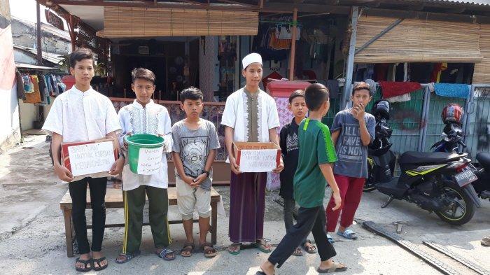 Muhamad Syafa yang baru berusia 13 tahun bersama teman-teman lainnya berkeliling membawa kardus untuk meminta sumbangan ke warga sekitar.