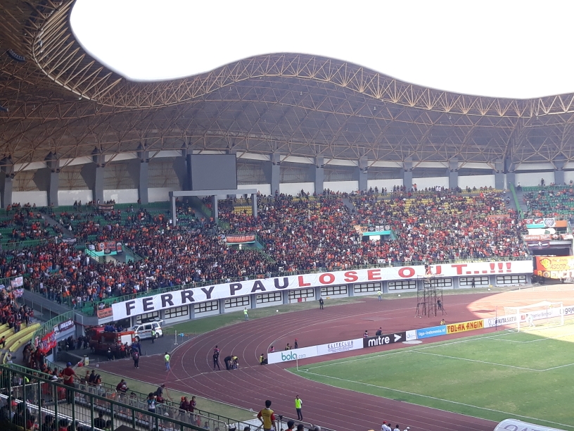 Di tribune utara, spanduk kritikan bertuliskan 'FERRY PAULOSE OUT...!' terpampang dengan jelas.