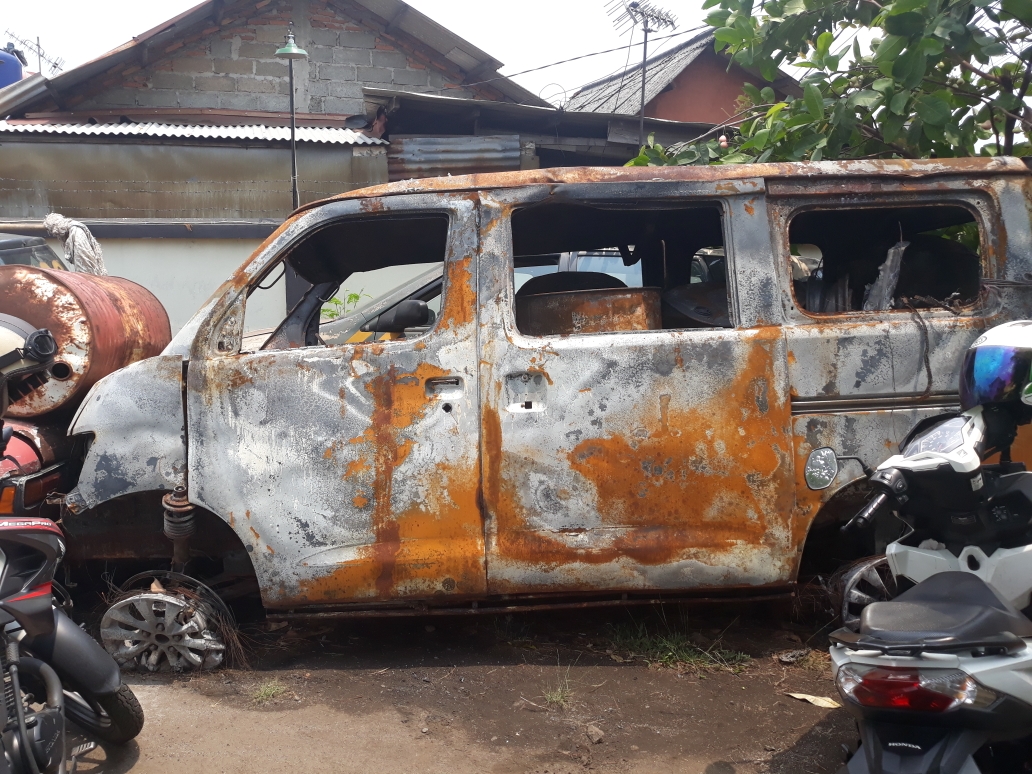 Sekujur bagian mobil yang hangus terbakar menandakan panas kobaran api yang mengharuskan 55 personel pemadam dikerahkan memadamkan api.