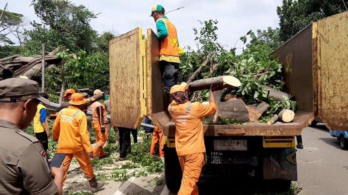 Pantauan TribunJakarta.com di lokasi, sejumlah pekerja Penanganan Prasarana dan Sarana Umum mengangkat batang pohon besar tersebut.
