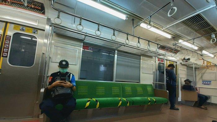 Pantauan TribunJakarta.com di dalam KRL, tiap kursi penumpang dipasang garis pembatas.