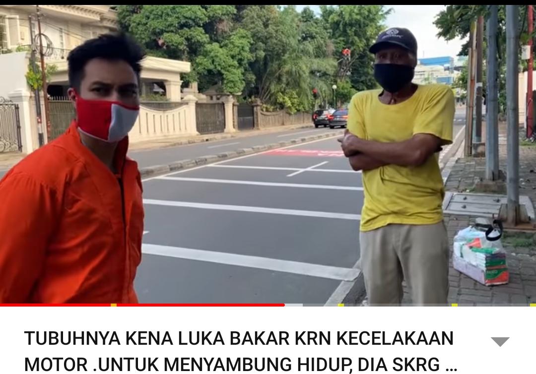 Baim Wong tersenyum saat melihat sikap tak biasa seorang pedagang tisu yang hendak diberikan bantuan berupa uang.