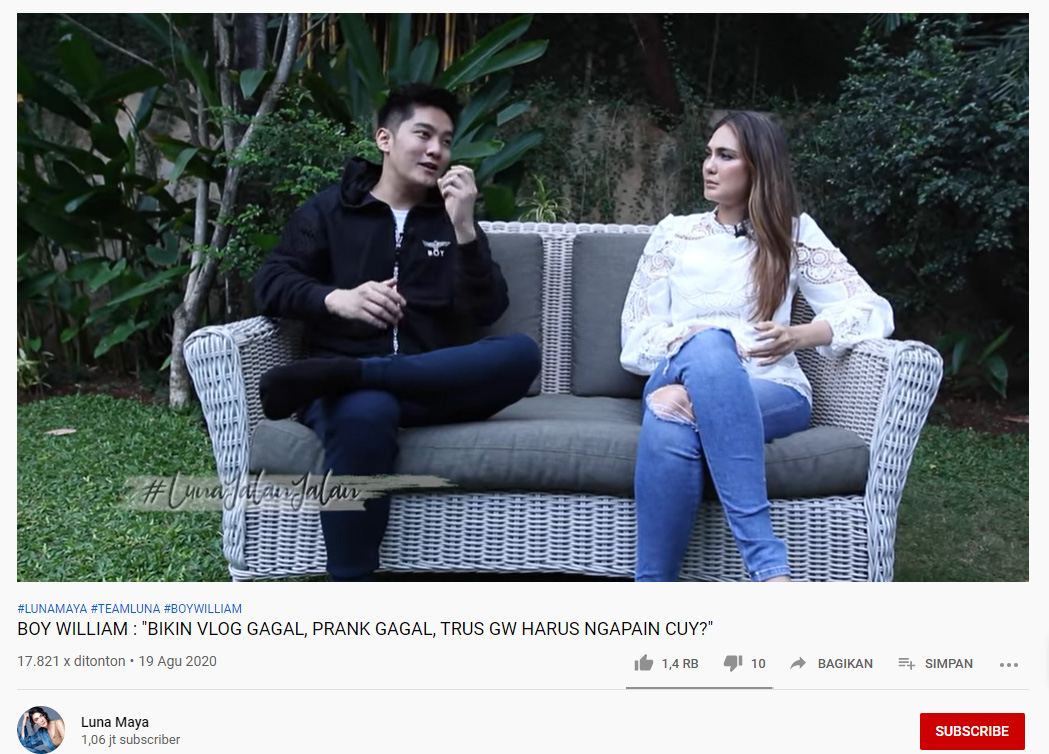 "Orang selalu mikir, ya lu mah gampang bikin konten karena lu udah duluan di dunia entertainment, istilahnya ada nama lah. Jadi lu gampang narik subcriber," ujar Boy William dikutip TribunJakarta dari YouTube Luna Maya (21/8/2020).