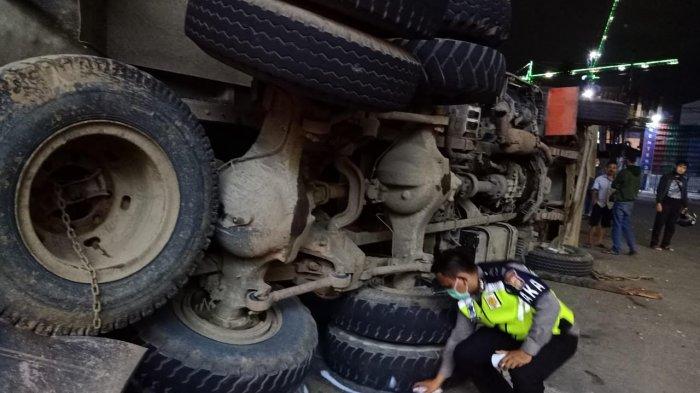 Seketika truk menabrak pembatas jalan dan terguling hingga menimpa Rizaludin yang sedang berhenti karena lampu merah.