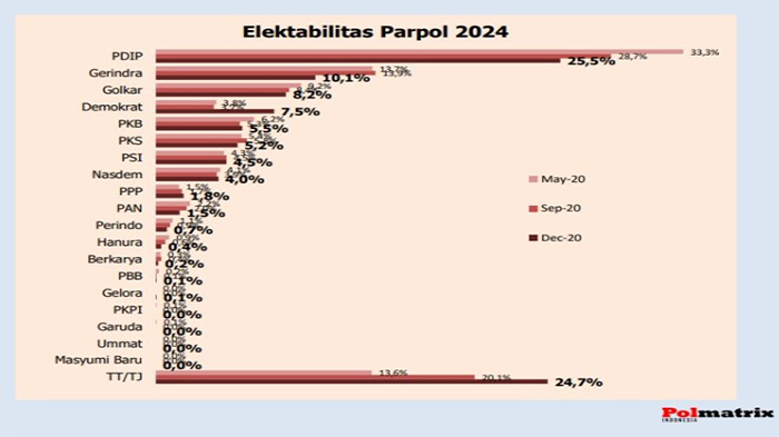 TRIBUNJAKARTA.COM - Temuan survei yang dilakukan Polmatrix Indonesia menunjukkan elektabilitas PDIP dan Gerindra melorot dibandingkan survei yang dilakukan bulan September 2020.