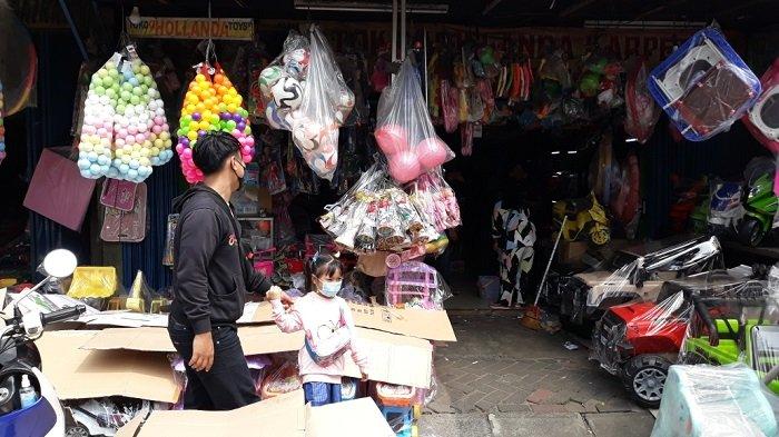 TRIBUNJAKARTA.COM, JATINEGARA - Pedagang mainan di Pasar Gembrong, Kecamatan Jatinegara, Jakarta Timur mengeluhkan penurunan omzet dagang pada libur Idul Fitri 1442 Hijriah.