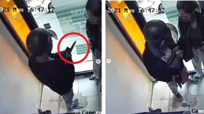 Aksi perampok terekam kamera CCTV sewaktu masuk ke bilik ATM ketika ada seorang wanita sedang mengambil uang di sana.