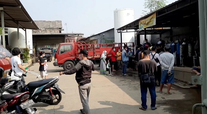 Imbas kelangkaan oksigen, warga berbondong-bondong mendatangi tempat pengisian oksigen di Jalan Raya Penggilingan.