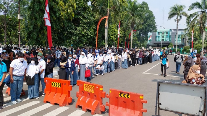TRIBUNJAKARTA.COM, TANGERANG - Lagi-lagi terjadi vaksinasi Covid-19 untuk pelajar di Kota Tangerang menyebabkan antrean yang sangat mengular di Pusat Pemerintahan Kota Tangerang, Kamis (2/9/2021).