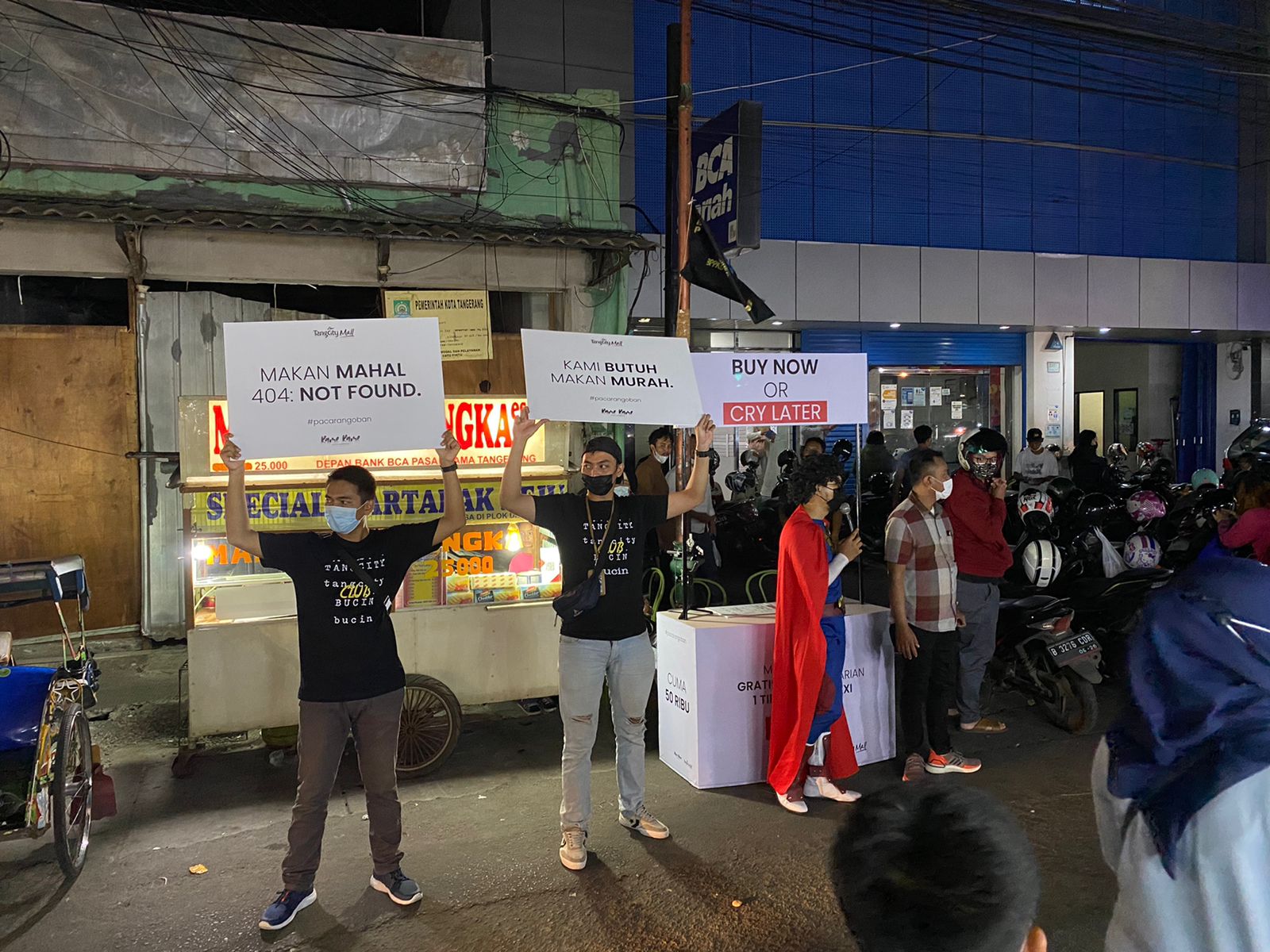 Seperti yang dilakukan pengelola mal di Kota Tangerang yang memilih mengenakan pakaian karakter super hero di kawasan Kuliner Pasar Lama, Kota Tangerang.
