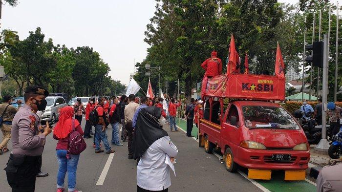 Mereka menuntut agar Upah Minimum Provinsi (UMP) DKI tahun 2022 naik 10 persen.