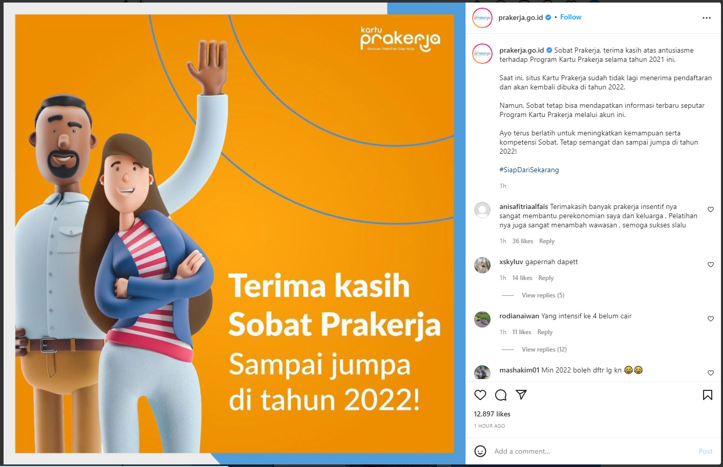 Informasi tersebut diketahui melalui unggahan di akun Instagram resmi @prakerja.go.id.