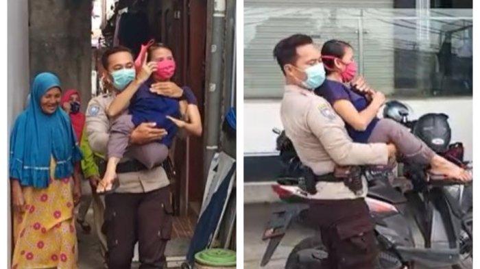 Agus yang bertugas sebagai Bhabinkamtibmas Srengseng ini sigap membopong Ibu Suci, seorang wanita disabilitas.