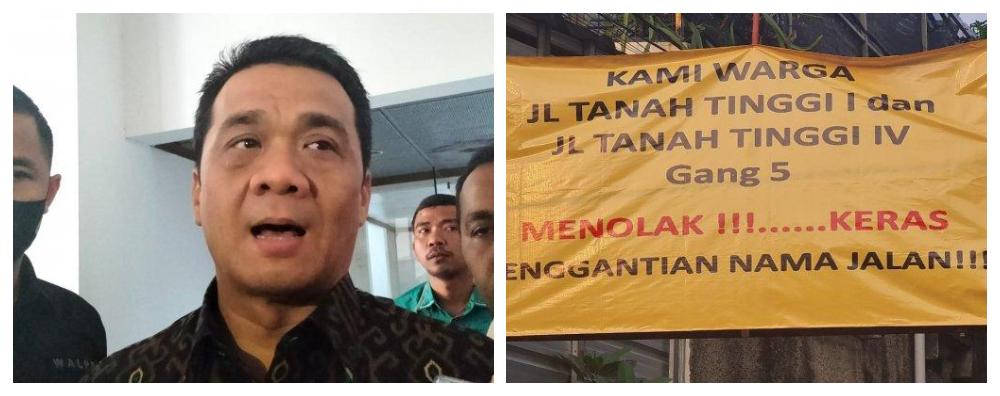 Kolase Foto Wagub DKI Jakarta Ahmad Riza Patria dan Spanduk Penolakan Warga. Wakil Gubernur DKI Jakarta Ahmad Riza Patria minta warga tak permasalahkan pergantian nama jalan dengan tokoh Betawi. Ini jaminan Ariza.