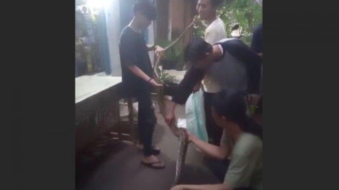 Winanto dibantu sejumlah warga menarik ular yang tengah melilit tiang kayu.