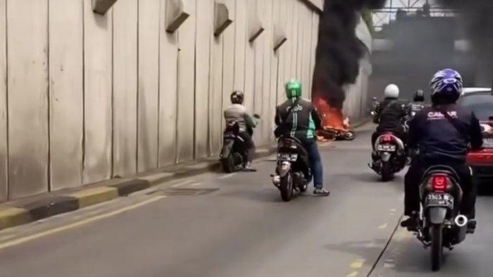 TRIBUNJAKARTA.COM, KEBAYORAN LAMA - Satu unit sepeda motor matic terbakar di underpass Pondok Indah, Jalan Sultan Iskandar Muda, Kebayoran Lama, Jakarta Selatan, Minggu (7/8/2022).