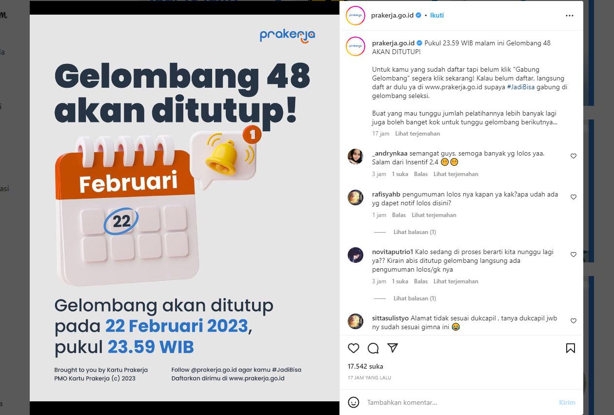 Melansir akun Instagramm @prakerja.go.id, Kartu Prakerja gelombang 48 ditutup pada Rabu (22/2/2023) pukul 23.59 WIB kemarin.