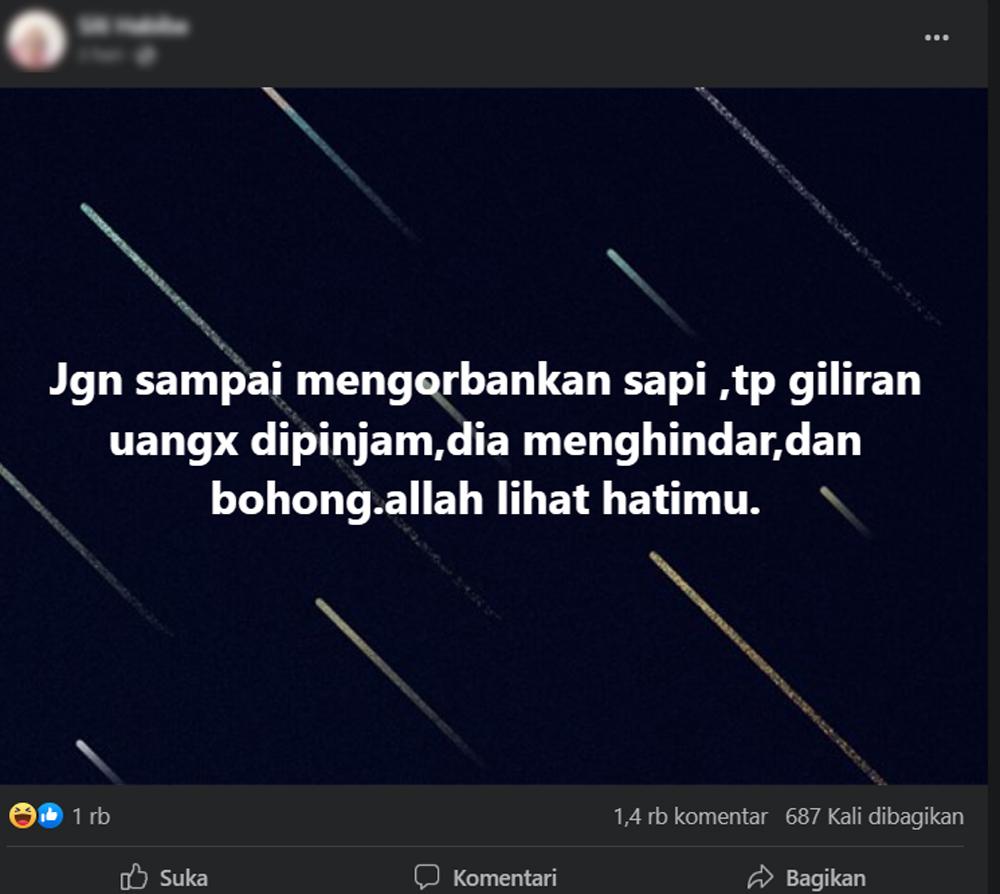 "Jgn sampai mengorbankan sapi, tp giliran uangnya dipinjamkan dia menghindar dan bohong, allah melihat hatimu," tulis SH dikutip TribunJakarta, Senin (19/6/2023).