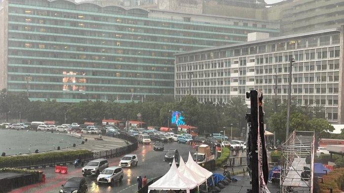 Hujan deras melanda kawasan tersebut hanya beberapa jam jelang perayaan tahun baru yang akan diselenggarakan di sepanjang Jalan Sudirman-Thamrin.