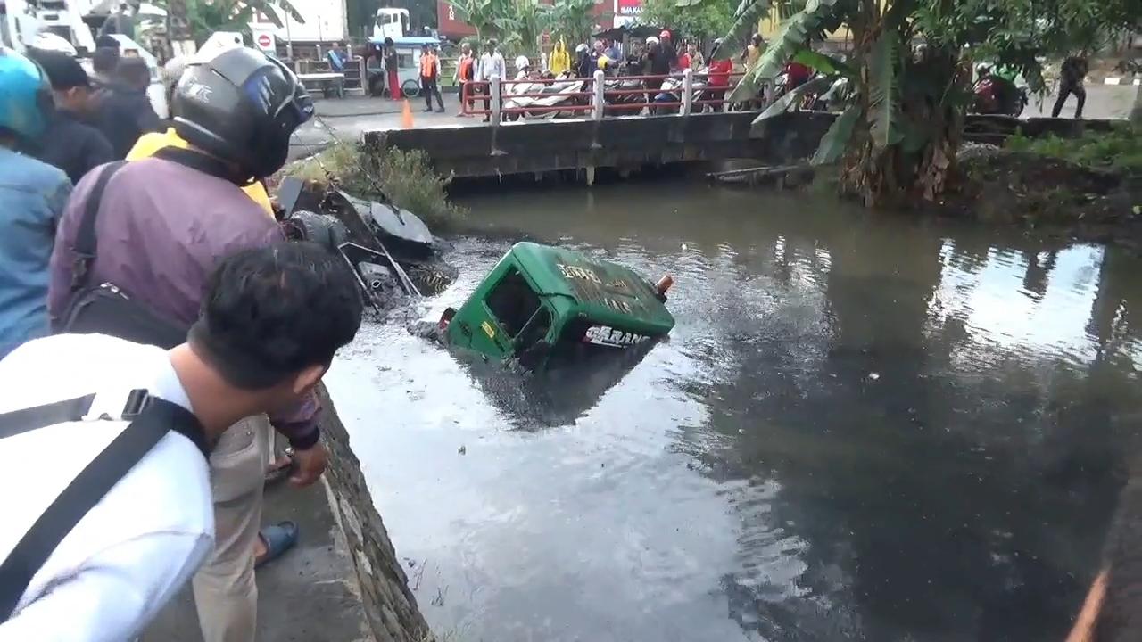 Kecelakaan membuat badan salah satu truk trailer terperosok dan nyaris tenggelam ke kali di Jalan Cakung Cilincing Raya.