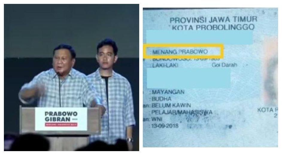 (Kiri foto) Dari hasil quick count atau hitung cepat, pasangan Prabowo-Gibran terlihat unggul. Untuk itu, Prabowo merasa bersyukur atas hasil sementara hitung cepat tersebut dan (kanan foto) Foto KTP bernama Menang Prabowo