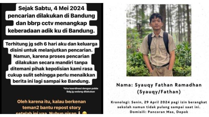 Viral di media sosial seorang pelajar bernama Syauqy Fathan Ramadhan hilang setelah izin berangkat sekolah sejak Senin (29/4/2024) silam.