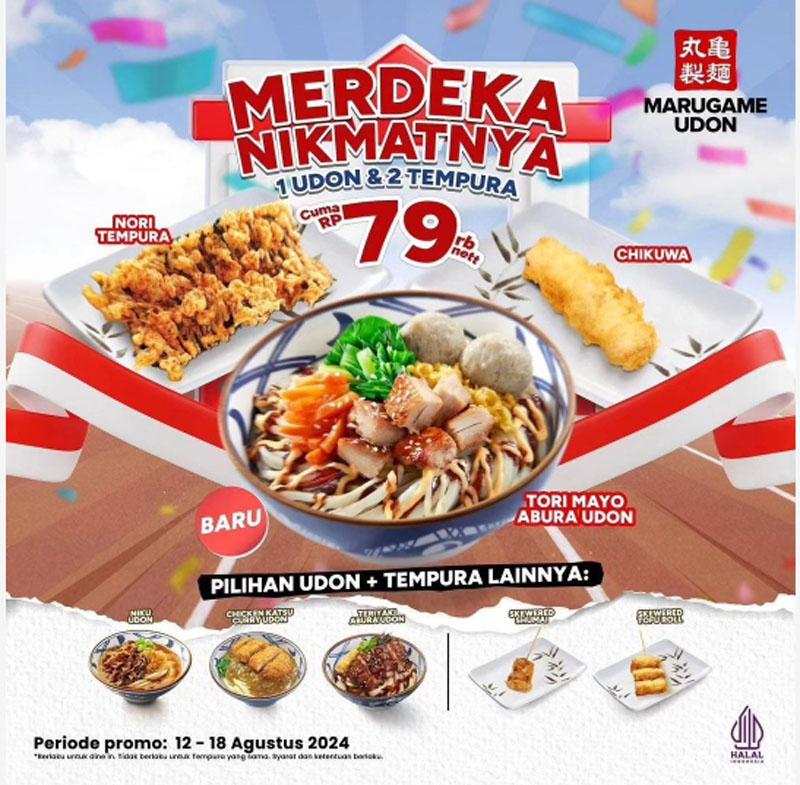 Dalam rangka Hari Kemerdekaan Indonesia ke-79 Marugame Udon menyediakan promo menarik, hanya dengan Rp 79 ribu kamu bisa dapat 1 udon dan 2 tempura.