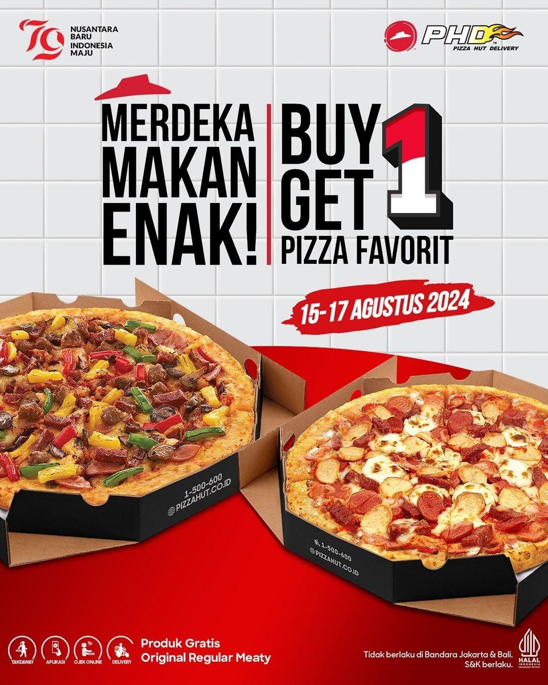 Jelang Hari Kemerdekaan, promo BOGO hadir lagi! Beli 1 Pizza Regular Crust apapun GRATIS 1 Original Regular Meaty Pizza.