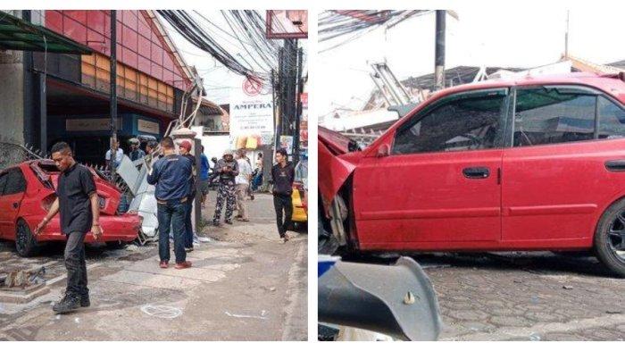 Terlihat bangkai kendaraan di tepi jalan, di antaranya sedan warna merah bernomor polisi D 1667 YVI yang ringsek.