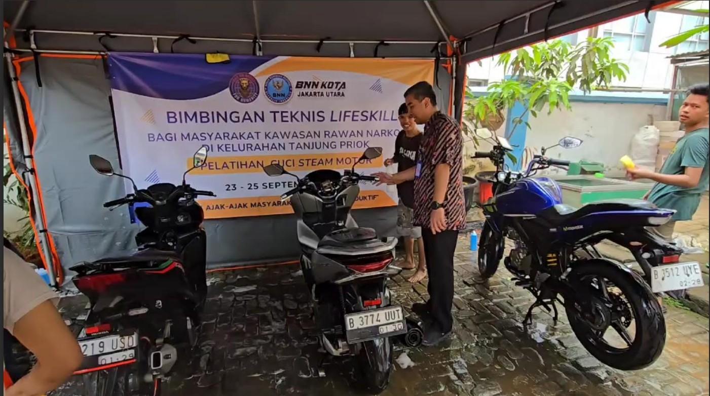 Badan Narkotika Nasional Kota (BNNK) Jakarta Utara menggelar pelatihan cuci motor atau steam motor di Kelurahan Tanjung Priok.