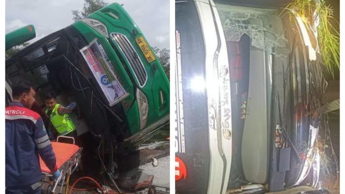 Kecelakaan pertama dialami bus pariwisata yang terguling di di jalur exit Tol Pemalang KM 312, tepatnya di Kelurahan Beji, Kecamatan Taman, Kabupaten Pemalang, pada Sabtu (25/10/2025).