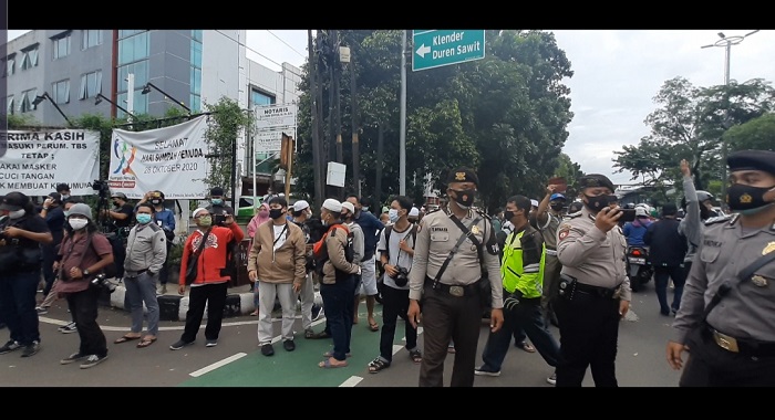 Mereka tidak diperkenankan masuk ke area rumah duka oleh petugas kepolisian untuk menghindari terjadinya kerumunan di dalam.