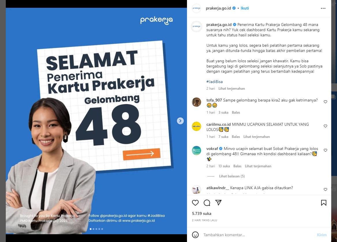 Melansir akun Instagram @prakerja.go.id, penerima Kartu Prakerja gelombang 48 telah diumumkan pada Sabtu, (25/2/2023). Berikut cara cek hasilnya.